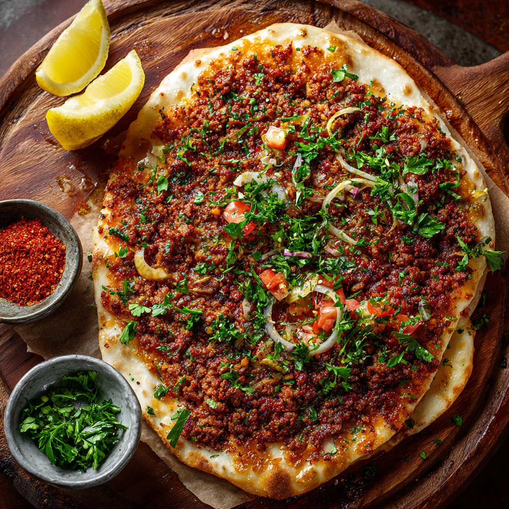 Lahmacun, often called Turkish pizza, is a thin, crispy flatbread topped with a flavorful mixture of minced meat, tomatoes, onions, garlic, and aromatic spices. It’s a popular street food in Turkey and perfect for a quick lunch, dinner, or snack. Served with fresh herbs, lemon juice, and a drizzle of olive oil, lahmacun is crispy, savory, and irresistibly delicious.
